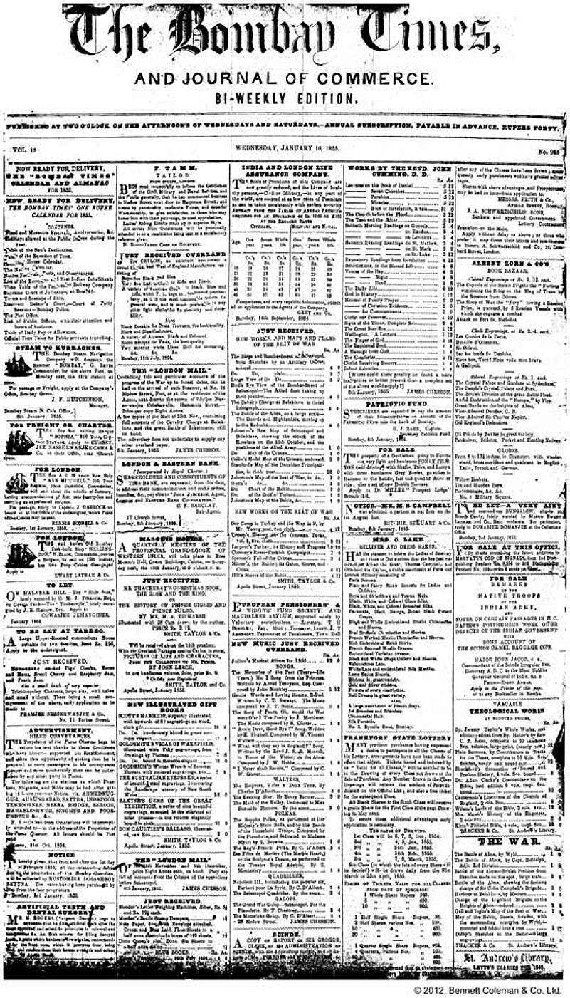 In 1855, at the age of seventeen, The Times of India was not yet known by that name, which it acquired only six years later—on May 18, 1861, when The Bombay Times and Journal of Commerce, established on November 3, 1838, merged with two other local publications. Historians of the press have quibbled about the paper’s exact date of birth. However, in a country that takes reincarnation with utmost seriousness and regards all avatars worthy of equal respect, it is small wonder that the paper itself has preferred to stick to the date of its genesis.