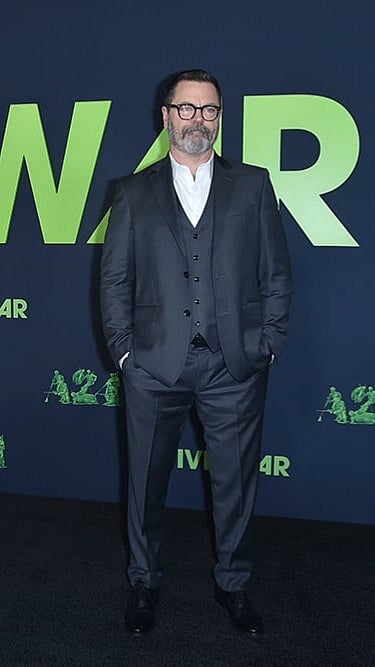Nick Offerman looks slick as he sports a shiny grey suit as he walks in for the premiere.