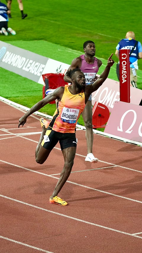 Jamaica's Rasheed Broadbell won the 110m hurdles by defeating the Olympic champion and three-time world gold medallist Grant Holloway.