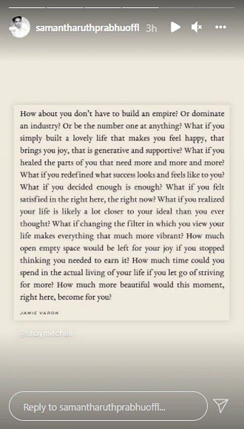 Actress Samantha Ruth Prabhu is slowly and steadily trying to move on in life after announcing her split from her husband, actor Naga Chaitanya. The actress keeps herself busy in a variety of ways, such as taking trips with her best friends or signing back-to-back films and partying with close ones. Prabhu has also become very active on social media, posting cryptic messages about moving on and reinventing herself. Prabhu expresses the same sentiment in her most recent Instagram story as well.