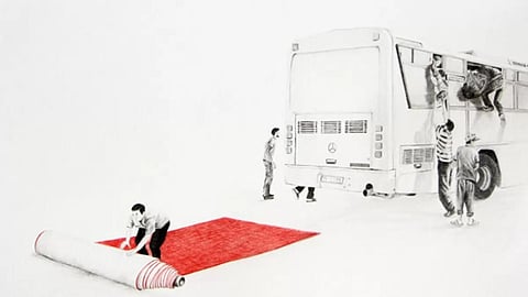 Through a set of drawings, random figures, and short animations on a loop, Massinissa Selmani teases and provokes us, triggering our imagination. As if he almost wants us to solve a puzzle but through our own reading and context. His ambiguous drawings, some even mimicking cartoons and inspired by, among many things newspaper clippings, showcase the art of absurdism to create situations that are unlikely to happen. But seem so familiar. These improbable assemblages add a comic element to tragic situations of political and social life.