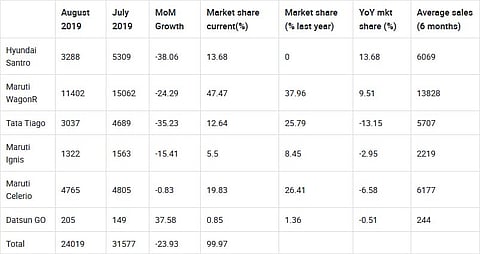 - Hyundai Santro was the worst affected car in the segment in August 2019.