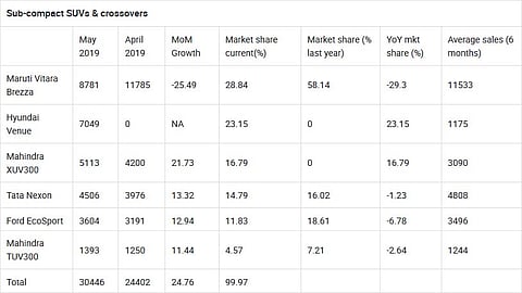 Vitara Brezza is the only SUV to record a negative MoM growth in the segment.