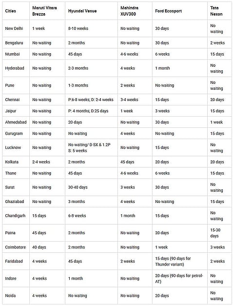 SUVs like the Nexon and XUV300 are readily available in many cities with average wait time between 2-6 weeks.