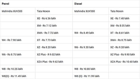 Mahindra has recently launched the XUV300 sub-4 metre SUV in India. And while Maruti Suzuki has the bragging rights for popularity in the segment (Vitara Brezza is the bestseller), places after the first are up for grabs. And that is what Mahindra will be eyeing for with the XUV300 - a position, that is currently occupied by the Tata Nexon. So, let’s compare variants of the XUV300 and the Nexon to find out which one, and in which variant, is the more value-for-money car for you.