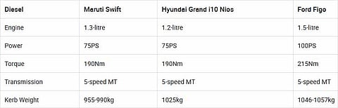 Hyundai recently launched the Grand i10 Nios at Rs 4.99 lakh (ex-showroom, Delhi) to take on the likes of the Maruti Swift, Maruti Ignis, Ford Figo and the Nissan Micra. While the demand for diesel cars are projected to fall once BS6 emission norms take effect, there continues to be buyers out there who prefer their frugal nature. So, we set out to compare the diesel-manual variant of the Hyundai Grand i10 Nios against the Maruti Swift and Ford Figo.