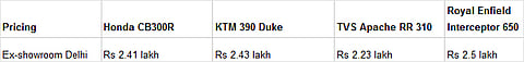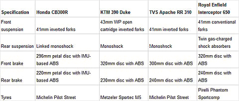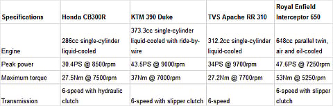 Honda has just launched the CB300R at Rs 2.41 lakh, which puts it up against some interesting rivals in the Rs 2 lakh to Rs 2.5 lakh price bracket. At the bottom of the range lies the TVS Apache RR 310, a faired alternative to the naked CB300R. Then you have the segment leader, the KTM 390 Duke, which does everything right. There’s also the Royal Enfield Interceptor that gets a 650cc, parallel-twin engine at the price of a 300cc, single-cylinder motorcycle. So what does the Honda CB300R bring to the party? Let's find out.