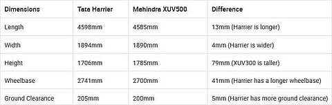 Tata’s Harrier is bigger than the XUV500 in all exterior dimensions other than height.