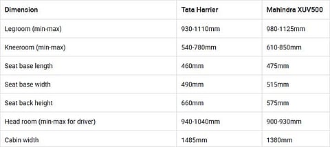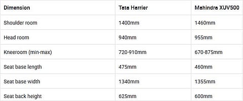 XUV500 offers more shoulder room and seat base width for second-row passengers although the Harrier offers more kneeroom and under-thigh support.