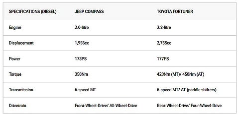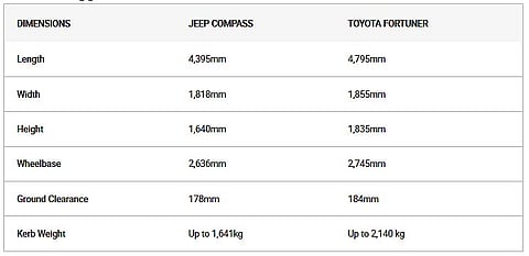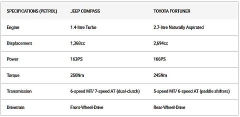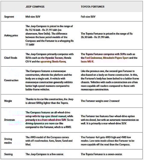 The Jeep Compass and Toyota Fortuner are the two titans of the mid-size and full-size SUV segments, respectively. Both the SUVs are bestsellers in their respective spaces. Here's how they stack up against each other on paper, if one wishes to compare them together.
