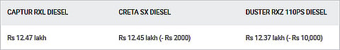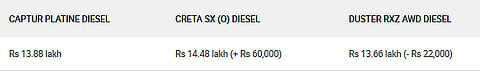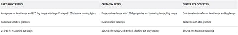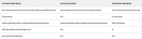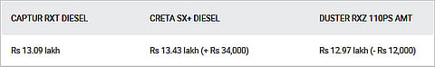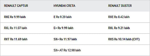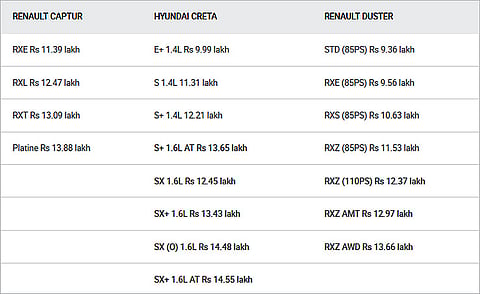 Here’s how the new entrant in the compact SUV segment, the Renault Captur, stacks up variant wise against the bestseller, the Hyundai Creta and its own sibling, the Renault Duster