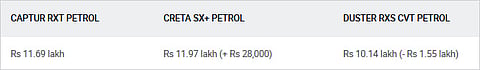 The dual-tone version of the Captur RXT and the Creta SX+ cost around Rs 17,000 and Rs 38,000 more than their respective regular variants.