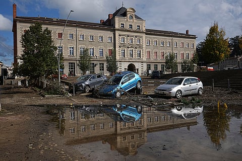 Firefighters inspect a damaged car in a parking lot of a shopping mall in Givors, central France, after torrential rains and flooding submerged roads and railways.