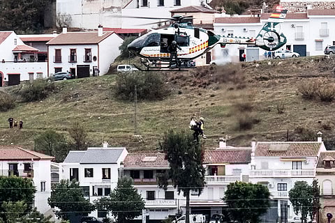 Emergency teams rescue a person who was stranded by the water in a Guardia Civil helicopter, after the floods preceded by heavy rains that caused the overflow of the river in the town of Alora, Malaga, Spain.