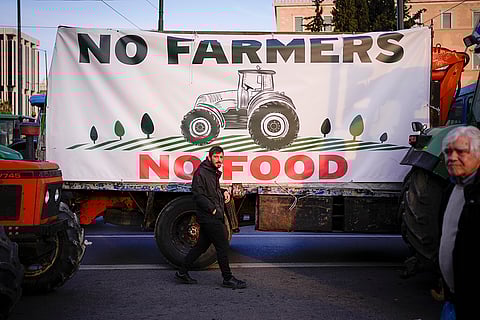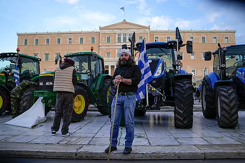 Protesting farmers stand in front of the Greek parliament in Athens, Greece.