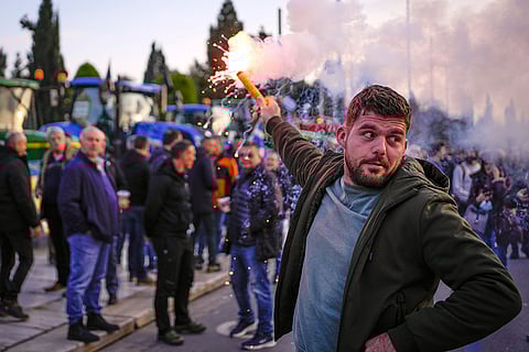 In front of the Greek parliament, protesting farmers rally in Athens, Greece.