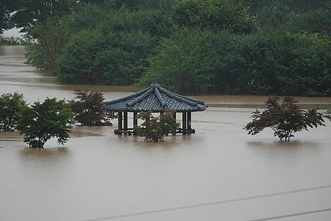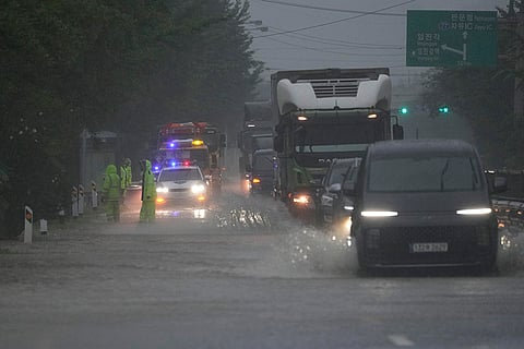 Vehicles drive through partly flooded street by heavy rain in Paju, South Korea.