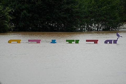 A logo of a park is partially submerged in flood waters after heavy rain in Paju, South Korea.