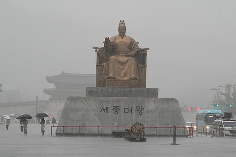 People pass by the statue of King Sejong amid heavy rains at Gwanghwamun Square in Seoul, South Korea.