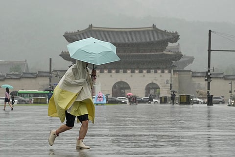 A woman runs amid heavy rains at Gwanghwamun Square in Seoul, South Korea.