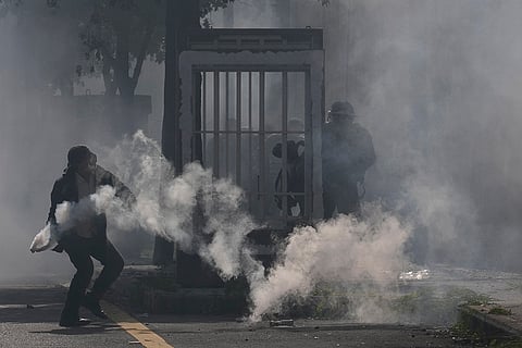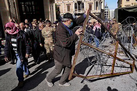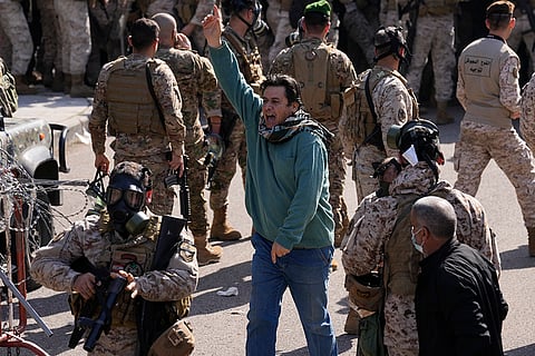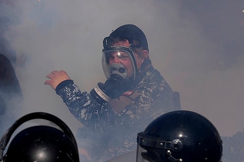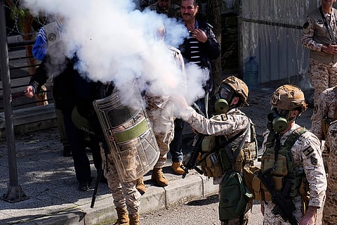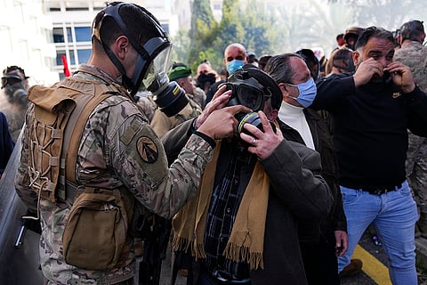 A Lebanese soldier helps his retired comrade after inhaling tear gas during a protest demanding better pay in Beirut, Lebanon. Lebanese security forces fired tear gas to disperse dozens of protesters, mainly retired soldiers, who tried to break through the fence leading to the government headquarters in downtown Beirut amid widespread anger over the harsh economic conditions in the country.