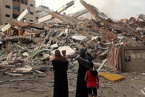 A family before the rubble of their residence, destroyed by an Israeli airstrike, in Gaza City during the 2014 Gaza War