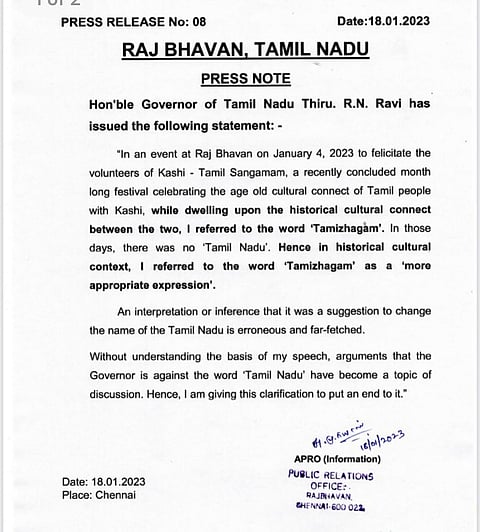 The statement further read, "In an event at Raj Bhavan on January 4, 2023 to felicitate the volunteers of Kashi - Tamil Sangamam, a recently concluded month long festival celebrating the age old cultural connect of Tamil people with Kashi, while dwelling upon the historical cultural connect between the two, I referred to the word 'Tamizhagam'. In those days, there was no Tamil Nadu'. Hence in historical cultural context, I referred to the word 'Tamizhagam' as a 'more appropriate expression'."