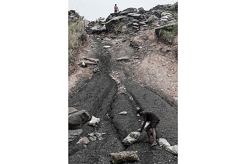 Deprived of their farmland given over to the coal mines surrounding their villages, residents make a living by scavenging coal from the scrap heaps around their houses. Agariya, Mandu Block, Ramgarh district, Jharkhand.