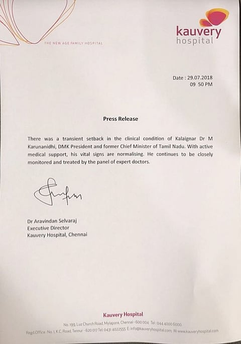 Hundreds of supporters gathered outside Chennai’s Kauvery Hospital where former Tamil Nadu Chief Minister M Karunanidhi is being treated, were asked to disperse after DMK leader A. Raja assured them the 94-year-old party patriarch was responding to treatment.