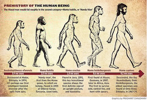 The alternate theory, in sum, is this: that evolution took place in parallel streams and many sub-species of hominins emerged over centuries. Last March, scientists discovered the oldest jaw bones and teeth in the human ancestral line in Ethiopia, pegging it to 2.8 million years. The remains can be tentatively assigned to Homo habilis, a transitional species combining both ape and human-like features. The finding ruffled some feathers and met with some scepticism. Implications of the Masol discoveries could muddle up the timelines even more.