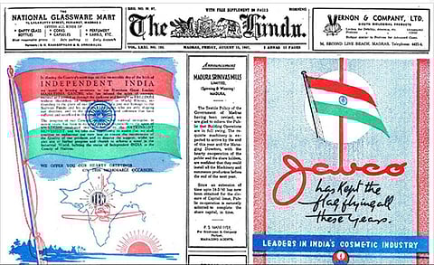 The Hindu's colourful front page hoisted free India's flag. In its second page editorial it talked about the daunting task ahead for the leaders of the nation. In a detailed column, it highlighted the International rights of the Indian Dominion status, not forgetting the "inauguration of Pakistan".