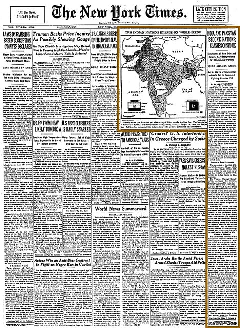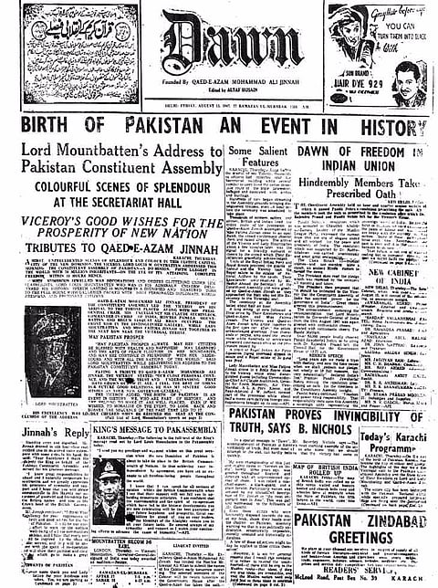 Pakistan-based daily Dawn elaborated on the birth of Pakistan and Lord Mountbatten's address to Pakistan Constituent Assembly. Another half of the divided page said "Dawn of freedom iin Indian Uunion". The bottom of the page were filled with greetings from all across.