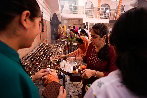 Kashmiri Hindu devotees light earthen lamps during the annual festival at the Kheer Bhawani Hindu temple in Tulla Mulla,, northeast of Srinagar, Kashmir.