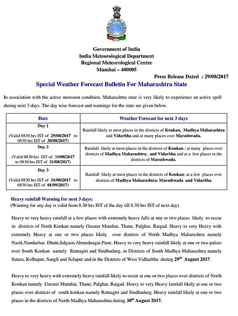 Referring to IMD's forecast for the next 24 hours, the statement said that heavy to very heavy rain is predicted for the next 24 hours in Mumbai city and suburbs.