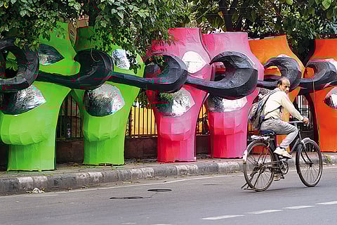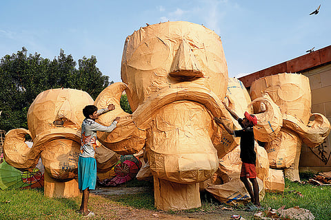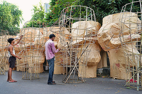 An imposing fuchsia pink visage of Raavan, having jet black eyes and a big black moustache, stands out. Placed next to it is an even taller purple-colour bust of Raavan. A man sitting on the pavement—oblivious to the traffic passing by on a regular day in Tatarpur area of West Delhi—is meticulously cutting small pieces of purple craft paper to be pasted on the bust made of bamboo.