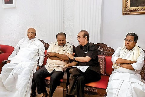 H.D. Kumaraswamy listens intently to Congress leader Ghulam Nabi Azad following a meeting with the state governor after the results, flanked by Siddaramaiah (right) and Mallikarjun Kharge