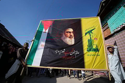 Shiite Muslims hold a banner of Hezbollah leader Hassan Nasrallah during a protest in solidarity with Palestine and against the killing of Hezbollah leader Hassan Nasrallah, at Mirgund north village of Srinagar.