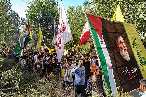 Shia Muslims take part in a protest march against Israel after killing of Hezbollah leader Hassan Nasrallah, on the outskirts of Srinagar.