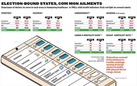 Numbers, they say, only tell half the story. But some statistics are staggering by themselves. Consider this: Madhya Pradesh, Rajasthan and Chhattisgarh together account for nearly half the number of primary health centres running without doctors in the country. The big picture is this: the three poll-bound states have a medical emergency of a different kind. They need doctors to attend to the immediate healthcare needs of millions of people. While healthcare—or the lack of it—is not considered a major issue to influence voting trends, primary healthcare in these states offer a dismal picture even going by India’s stymied public healthcare facilities.