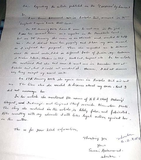 Full text of the handwritten letter by Swami Aseemanand, an accused in the Samjhauta Express blast case, who is lodged in an Ambala jail, in which he has denied a report published in The Caravan magazine in which he has been quoted as saying that RSS chief Mohan Bhagwat sanctioned terrorist attacks between 2006 and 2008: “It is very important that it be done. But you should not link it to the Sangh.”