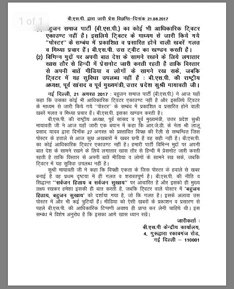 “Any post/poster generated on the social media (read twitter) on the working of the party does not carry credibility as there is no official twitter handle. BSP condemns the tweet,” said the press release.