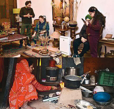 The great divide Harinder Singh and family sitting around an air purifier in their Defence Colony home (top); Nirmala Devi in her Anand Vihar home