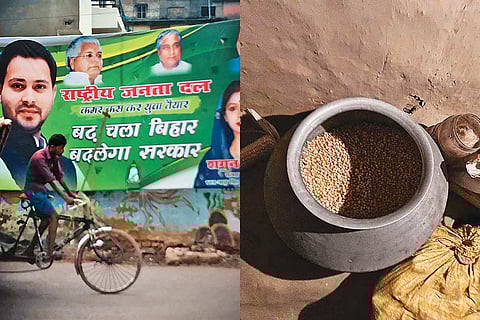 Snapshots An election poster in Patna; and (right) foodgrains at Laungi’s house.