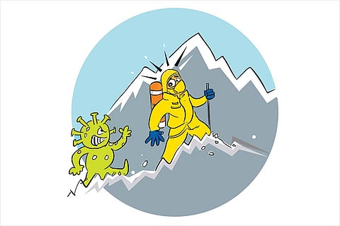 This climbing season—the short fair-weather April-May window—Nepalese authorities can hope mountaineers infected with Covid won’t pass it on to anybody else because “scalars aren’t vectors”. Jokes apart, what other alibi could they call up other than the obvious—dollars of rich foreigners—in their new record of issuing 394 permits so far for expeditions to Mount Everest? The previous feat was 381 permits in 2019, the year 10 climbers died as they were all stopped nearly three hours at dizzying altitudes—forced to burn up their precious oxygen supplies as they waited for a crowd of 150 others to clear the Hillary Step, the “death zone”. A foreign climber pays US$ 11,000 for the permission. For the record, Covid is a nifty climber too, and cases have been reported at the Everest base camp.