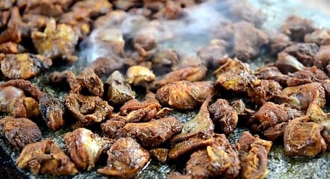 Mosque Road is one of the busiest shopping roads in Bangalore and becomes busier during Ramadan. Even otherwise, Mosque road is a foodie paradise due to the sheer number of restaurants. During Ramadan, this is coupled by the fact, that every establishment has street-side carts and stalls with a range of dishes to break the fast with. This is when the roads at its festive best with street lights twinkling and carts serving up the famous patthar ka goshth, non-veg samosas, seekh and shami kebabs, tikkas, prawns, haleem, shahi toast, kheema paya, korma, biriyani, and other mouth-watering delicacies. It was mandatory that we took time out to visit Mosque Road at iftaar. Vivek spent two years in Lucknow and till date his comfort food is mutton thanks to Tunday’s kebabs. He was very sure that the patthar ka goshth at Mosque Road would melt in his mouth.