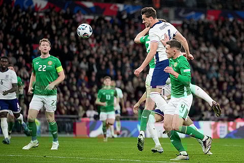 England's Taylor Harwood-Bellis, top, scores his side's fifth goal during the UEFA Nations League soccer match between England and the Republic of Ireland at Wembley stadium in London.