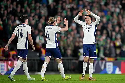 England's Conor Gallagher celebrates with Curtis Jones, right, after scoring his side's third goal during the UEFA Nations League soccer match between England and the Republic of Ireland at Wembley stadium in London.