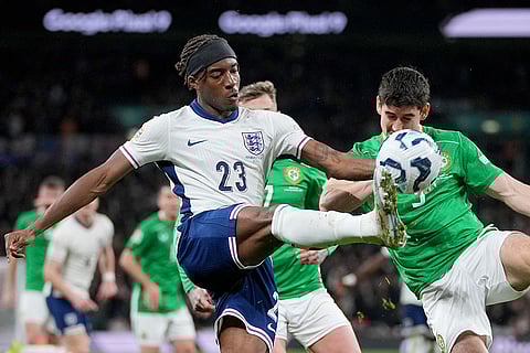 England's Noni Madueke clears the ball away from Ireland's Callum O'Dowda, right, during the UEFA Nations League soccer match between England and the Republic of Ireland at Wembley stadium in London.
