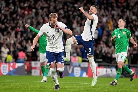England's Harry Kane, left, celebrates after scoring the opening goal from the penalty spot during the UEFA Nations League soccer match between England and the Republic of Ireland at Wembley stadium in London.