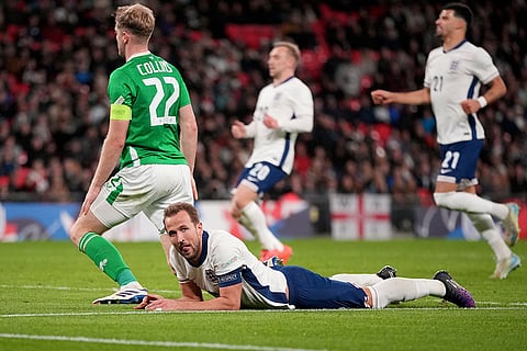 England's Harry Kane, on the ground, reacts after failing to score during the UEFA Nations League soccer match between England and the Republic of Ireland at Wembley stadium in London.
